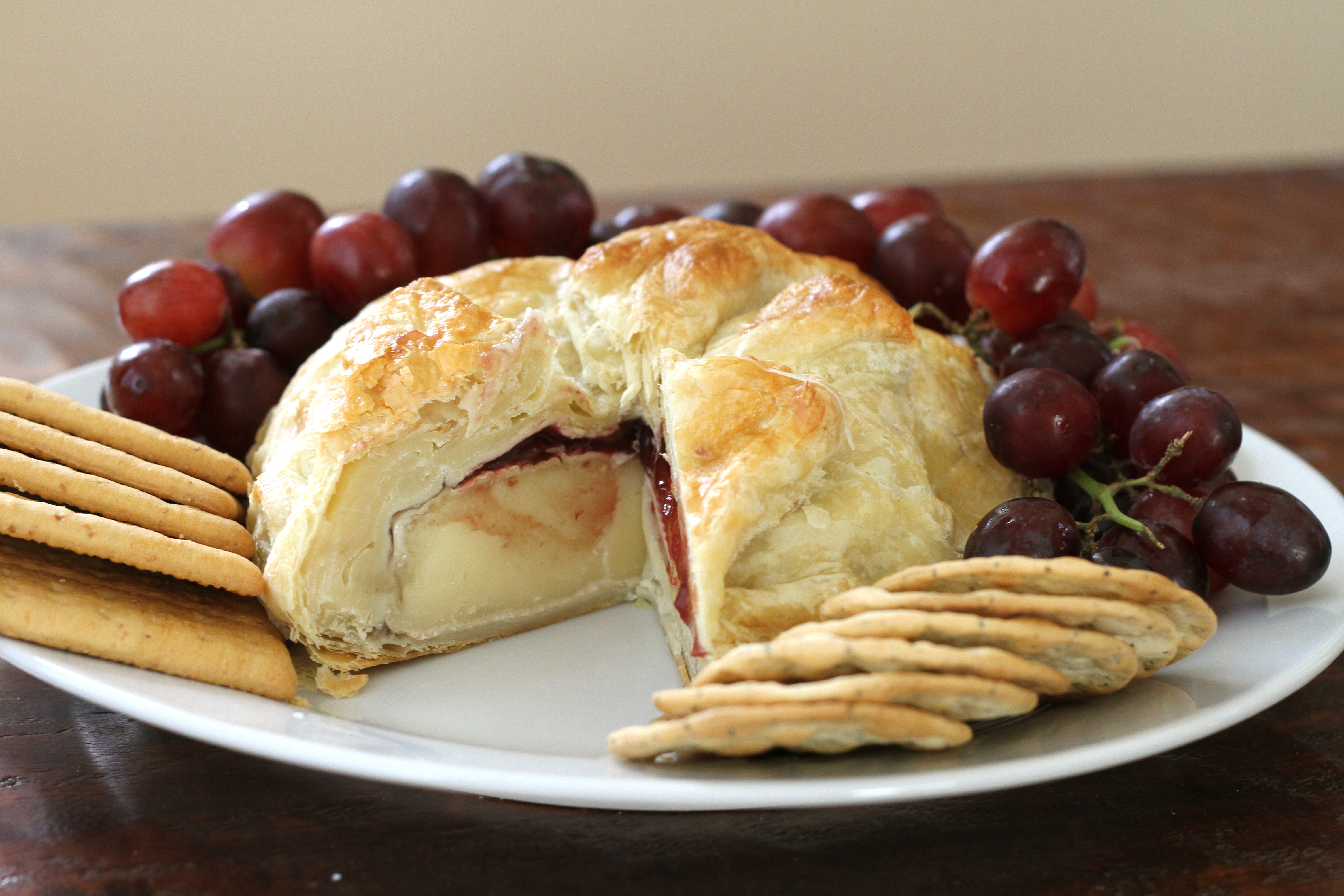- Pour cranberry sauce on topside of Brie wheel and fold over puff pastry sheet wrapping Brie wheel completely