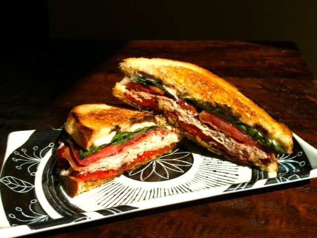 - Layer mozzarella cheese, basil, tomato, prosciutto, turkey, and roasted red peppers on pesto slice of bread, then top with other slice and return to grill pan until toasted and cheese is melted.