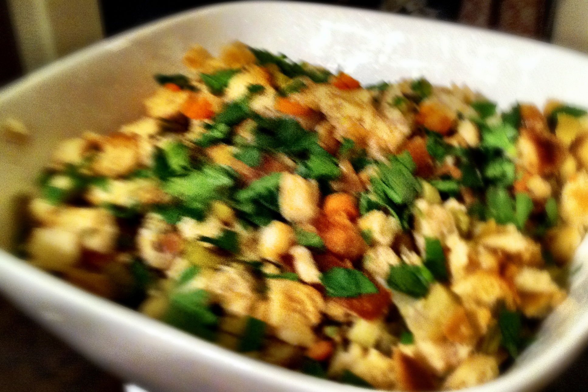 I don’t know about you, but for me I think stuffing is the one item on the Thanksgiving menu that tastes great 2 days before the day after tomorrow (aka today) :), tomorrow, and the day after that. Turkey can get dry, mashed potatoes aren’t the same microwaved, and green beans get soggy, but not stuffing! Stuffing takes on an even more delicious quality the longer it marinates.