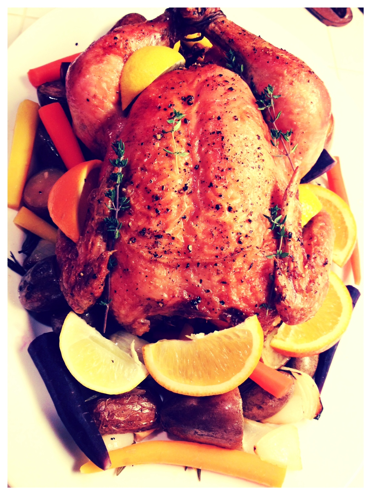I like to serve my roast chicken with roasted potatoes and onions and steamed carrots. Why roast some vegetables and steam others? I roast the potatoes and onions because the caramelization that occurs when doing so cannot be beat. I steam my carrots for a couple of reasons; 1. steaming is a great way to cook your veggies and retain all of the nutrients inherent to them, thus all of the wonderful antioxidants that carrots poses you will still benefit from. 2. I can’t lie, I really like the color of carrots and steaming them enhances the color perfectly. 🙂 In addition, I never bake vegetables that I plan on eating with my meats, call me paranoid but I feel like it’s safer (no cross contamination going on) and healthier (the fats from the meat don’t spill onto the vegetables.) Also, I overload on the citrus when I roast my chicken, I love having it bake inside the chicken and love to squeeze fresh pieces on top of each serving for that extra something.