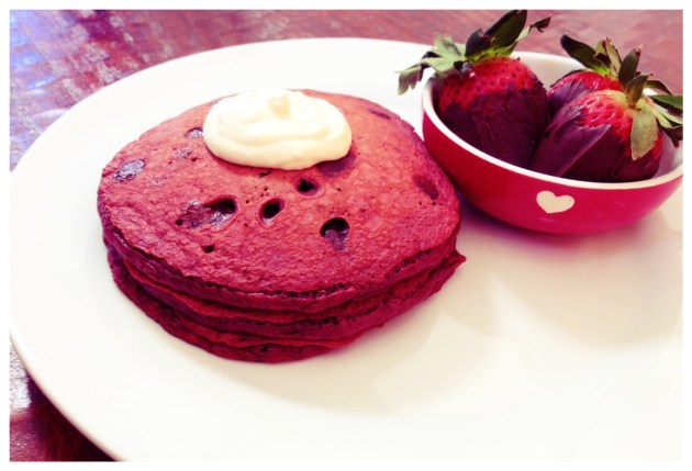 This year I made red velvet pancakes sprinkled with chocolate chips and topped with a dollop of maple infused cream cheese and just because it’s Valentine’s day weekend I decided to add some quick chocolate covered strawberries too! YUM!