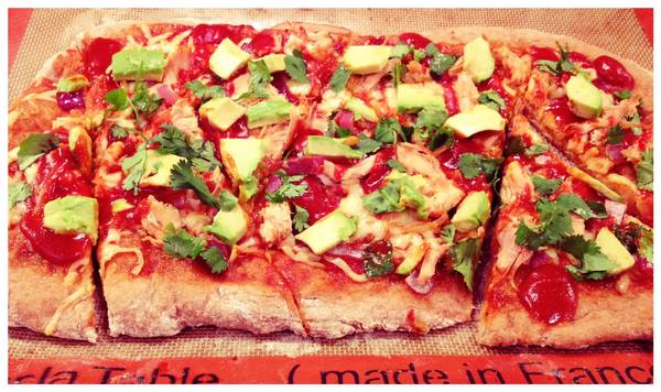 Recently I made BBQ chicken pizza and personally,I thought it was better than CPK’s version (gasp). I started it off by making a delicious whole wheat dough, I then melted a little butter and honey together to brush on top of the dough to give it a slight sweetness. I then brushed my favorite BBQ sauce on top and topped it with red onion, freshly shredded Gouda cheese, and shredded chicken. After the pizza finished cooking I gave it one more drizzle of BBQ sauce and sprinkled it with chopped cilantro and avocado slices. DELISH! My dough recipe will actually yield enough for two pizzas, I usually freeze 1/2 the dough for another day. Enjoy! 🙂