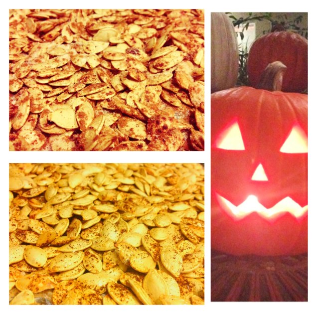 The other night I was happily partaking in one of my favorite fall time activities while my friend exclaims “I can’t wait to eat these!” As I turn to express irrational possessiveness over my prized Jack-O-Lantern I see her with one hand deep in her pumpkin and the other one holding a handful of seeds. “Pumpkin seeds!” I exclaimed. I immediately got excited to try this. Each year I carve pumpkins and each year I end up throwing the yummy seeds away, shame on me.