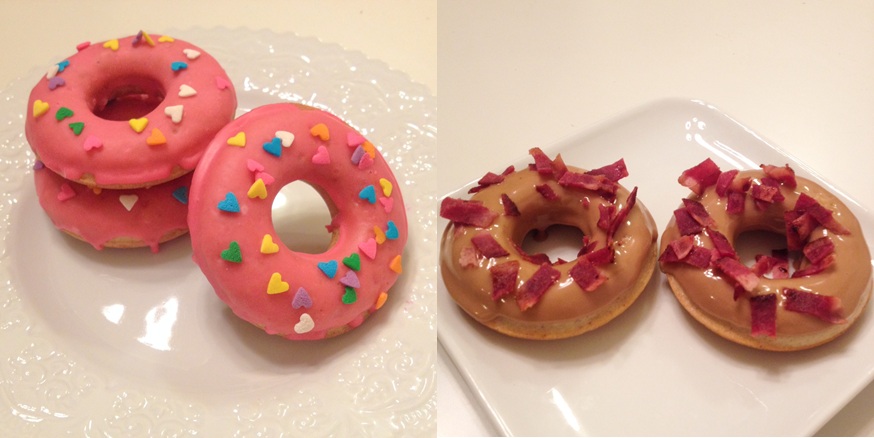 - 1/4 tsp of your favorite food color or flavoring. – I used pink food coloring for half of my icing mixture and then topped the donuts with sprinkles. For the other half of the icing, I used Maple flavoring then topped the donuts with crispy turkey bacon.